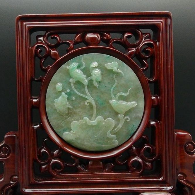 【宝贝说明】 独山玉透水浅天蓝料手工雕刻而成,玉质细腻水头足,圆形玉牌,主体勾勒这样一种生动场景:晚风习习,圆月若隐若现,荷塘鱼儿跳跃,两只鸟儿立于荷茎之上,有动有静,动静有致,富有自然山水之逸境,令人赏心悦目,已镶红木底座,摆放于书房客厅办公室,雅趣横生,高端大气上档次。精妙玉品,不容错过。