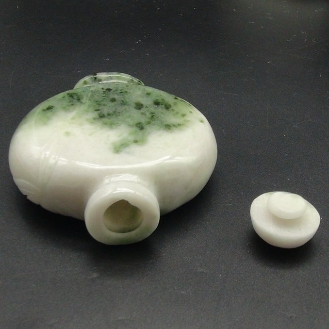 【宝贝说明】 独山玉青白料制成香水瓶(鼻烟壶),中空可以装上香水放在车上或家里,瓶盖螺丝口,能取掉拧上,瓶体雕刻竹叶,表达“祝君平安”之意,工艺精湛,实用性与艺术价值合二为一,精美玉品,值得拥有。