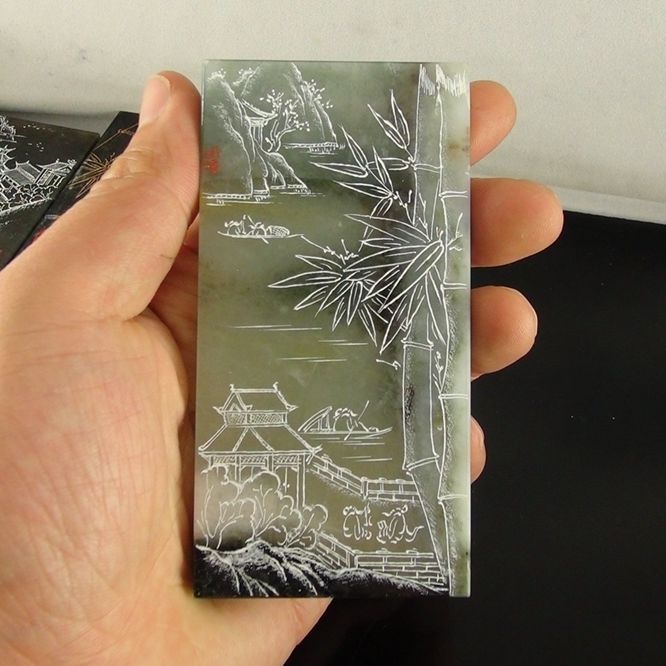 【宝贝说明】 独山玉透水青白玉料切割打磨抛光成玉牌,浅雕为山水风景画,并涂上颜料,刻画河中泛舟场景,远山近岸,亭台楼榭,劲竹苍苍,桂花正香,悠哉乐哉,给人无限艺术美感。精美独山玉料配之传统中国山水画,可谓高山流水,子期伯牙,真乃绝妙玉品,玉美价优,值得拥有。