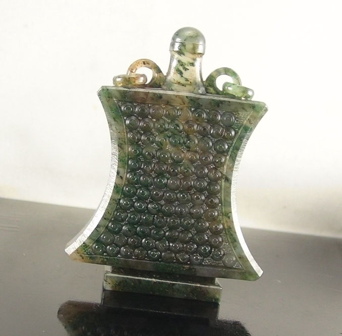 【宝贝说明】 非常精致绝妙的独山玉仿古双环香水瓶,中空可以装上香水放在车上或家里,瓶盖螺丝口,能取掉拧上,瓶体双面谷粒纹,古朴典雅,汉式风格,实用性与艺术价值合二为一,成就独山玉玉器无上妙品, 原创玉品,独一无二,稀世珍藏,一旦拥有,别无所求。