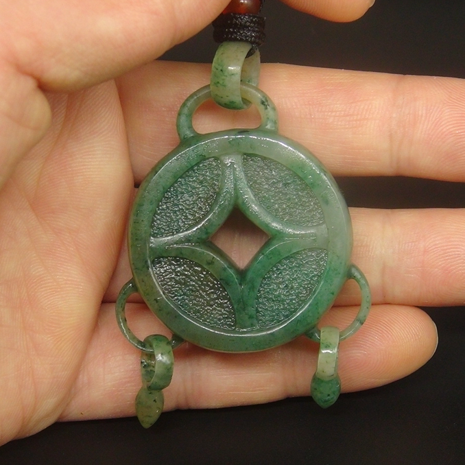 【宝贝说明】 独山玉透水天蓝料雕刻而成,立体雕刻古钱币造型,钱币顶部和下面雕刻转动的活环,寓意“赚钱”,玉品取古钱币的造型,融入玉石雕刻的技法,进行创新性设计雕刻,雕就符合传统文化内涵和现代审美的玉石新品,古风大雅,新韵神品,从工作室直销出货,玉美价优,值得拥有。